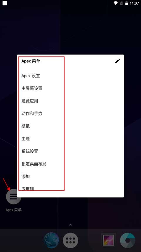 3、设置完成后,桌面会显示Apex菜单,点击该菜单,即可弹出各类功能选项供使用。
