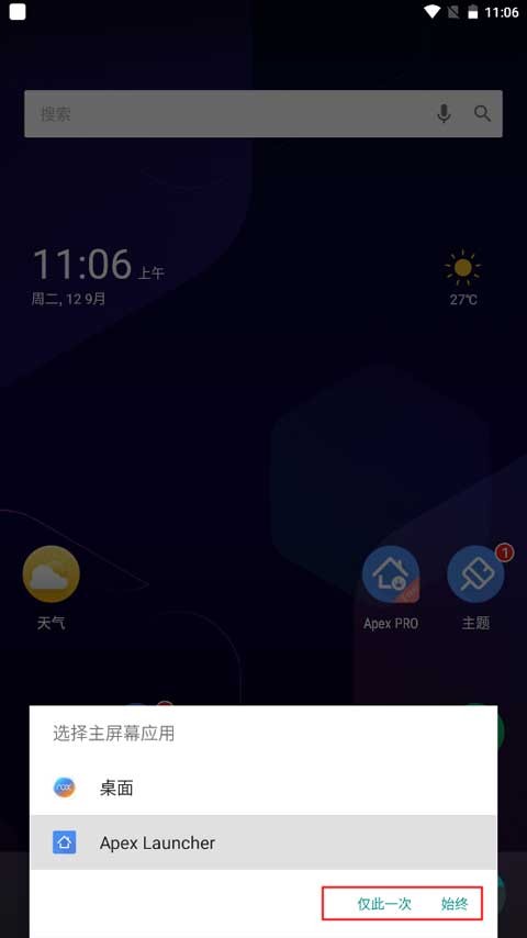 2、此时会弹出两个主屏幕应用选项,选中Apex Launcher,再点击下方仅此一次或始终即可完成设置。