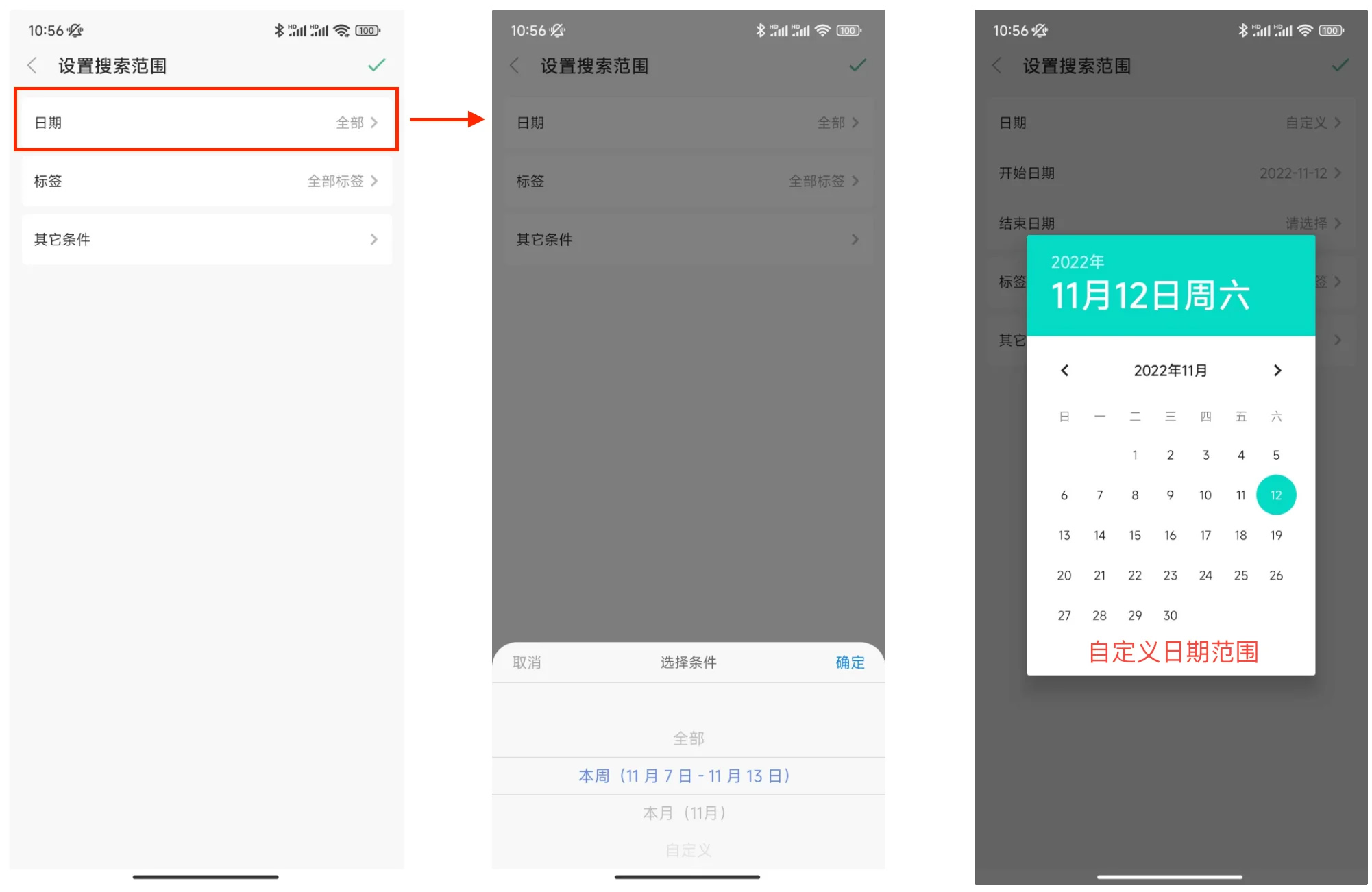 2、点击「日期」选取你想要检索的日期范围,可按照「本周」、「本月」,也可以自定义起止时间