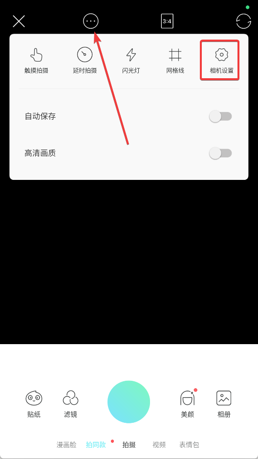 2、进入拍照界面,点击上方的三点按钮,选择相机设置