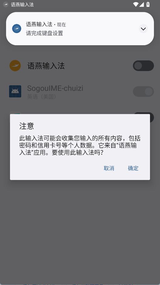 2、启用语燕输入法,点击确定