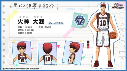 简介:拥有双重人格的射手,在胜负关键时刻能频频进球,是球队的精神领袖。随着锻炼成长,虽有些勉强,但已经可以像火神大我一样接住黑子会加速的传球。