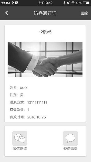 2. 访客管理:支持在线发送临时访客通行证,访客凭此通行证在规定时间内进出指定门禁,并自动保存访客记录,便于追溯查询。
