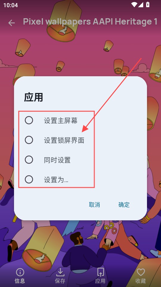 3、点击应用选项,可将该图片设为锁屏、桌面壁纸,也可选择同时设置两者。