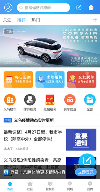 2、切换至【社区】页面,可看到义乌城事、义乌楼市等特色板块,便捷获取本地相关信息。
