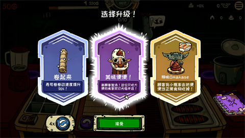 在一轮又一轮的上菜中提升等级,自由选择强化效果:可以解锁全新寿司配方,选择趣味增收效果,例如让顾客连盘子一起吃掉,省去收拾麻烦,在后期客人多、制作复杂时,大幅缓解现场混乱压力。