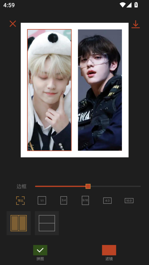 3、页面跳转后,调整边框、设置比例、选择形式,完成拼图