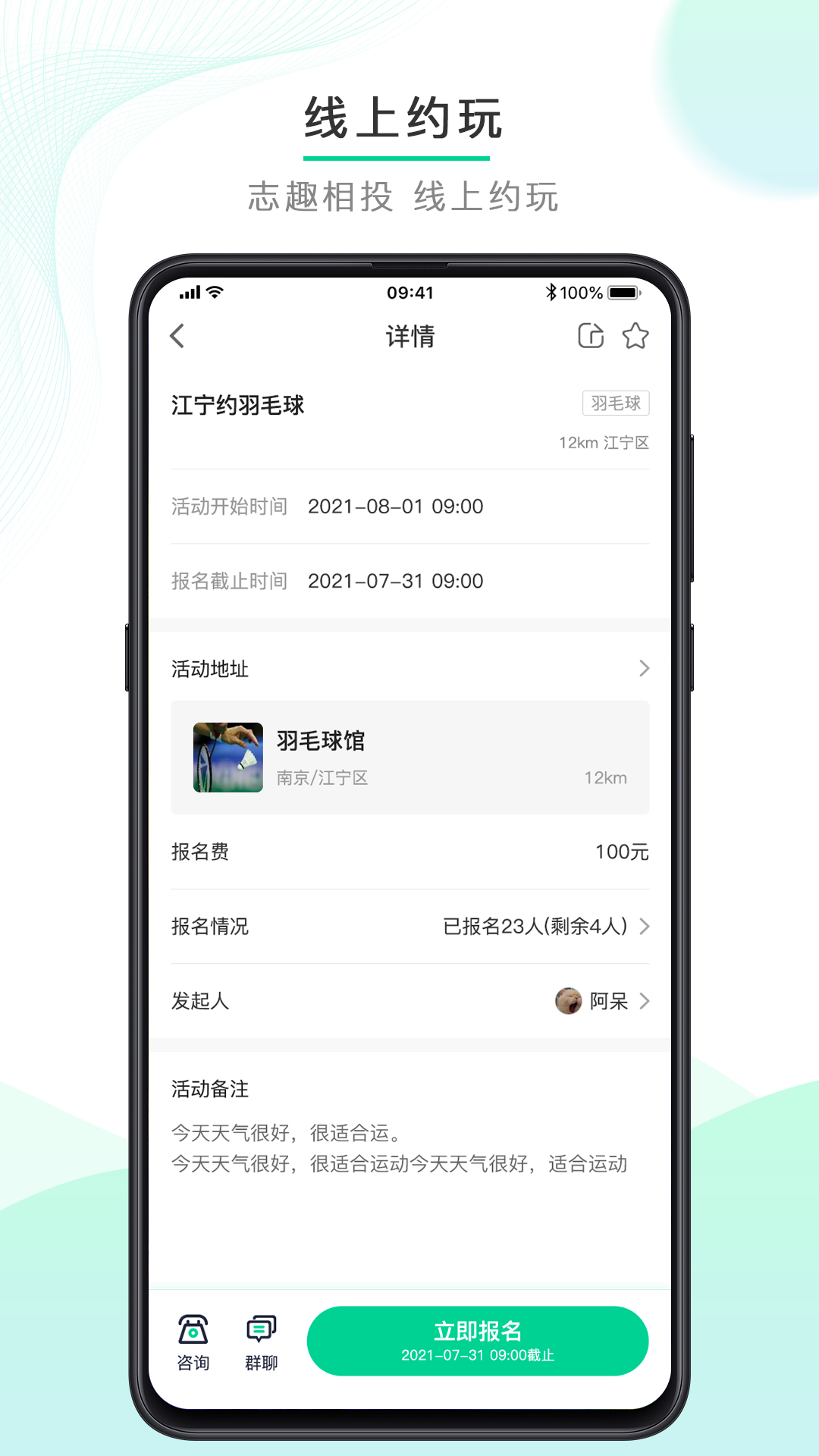 在线发起约球,找到跟自己水平相当的人,并结交朋友。多钟约球付费方式可选。