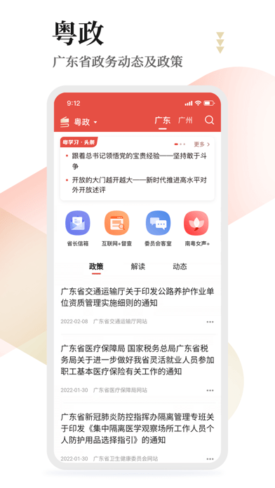 2、同步聚合“老广的小康”“新闻”“粤政”等应用频道,彰显党媒本色和政务属性。