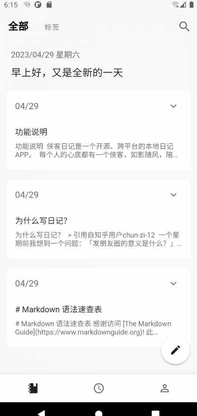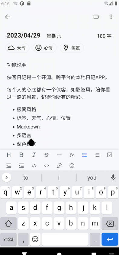 侠客日记App是一种记录类的工具,能够为用户提供随时随地都可以进行记录的服务,也可以作为一款日历备忘录来进行使用,在软件上有着强大的记录功能,不但为用户提供了多样化的主题设置还能够把用户的记录内容进行加密管理,这样一来能够的管理和保护笔记内容了。