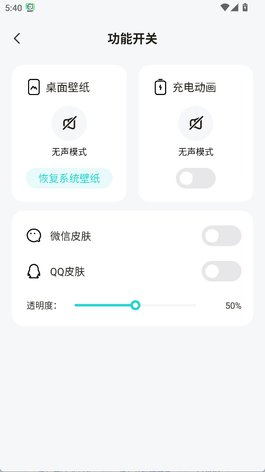 3、在设置界面的功能开关里开启微信皮肤后,可以设置透明皮肤