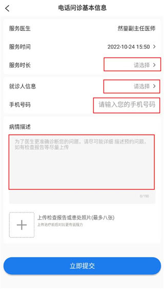 6、填写病情基本信息及相关资料,提交后即可进入问诊流程