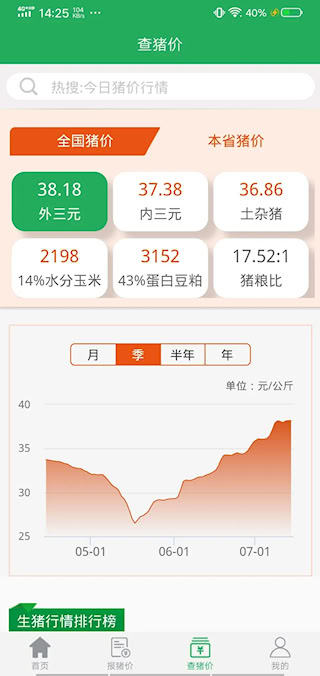 4、软件覆盖了全国的猪价信息,在首页展示了外三元、内三元以及土杂猪等品种的猪价情况。