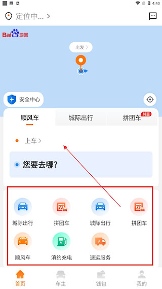 1、首页定位集成顺风车、城际出行等多类服务入口,输入目的地即可智能推荐路线,下方提供多种乘车选择,显著提升选乘效率与便捷性,体现软件功能全面性。