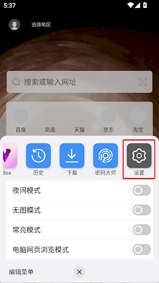 1、手势导航设置:点击左上角头像进入设置界面,开启网页手势功能,通过指定形状滑动实现前进等操作。