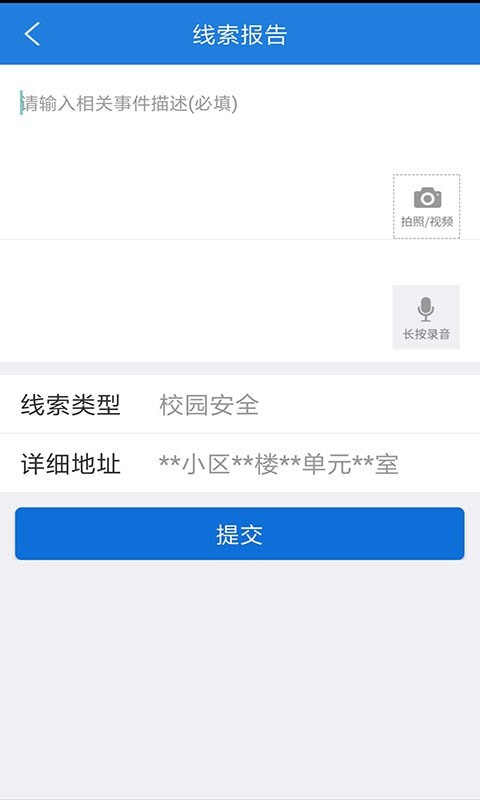 1、当群众发现特定类型的违法犯罪线索时,通过“公安110”APP,向公安机关举报。线索可附加短视频、声音、文字、图片说明。这项功能可帮助群众方便参与社会治安体系建设。