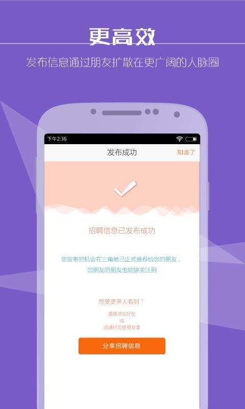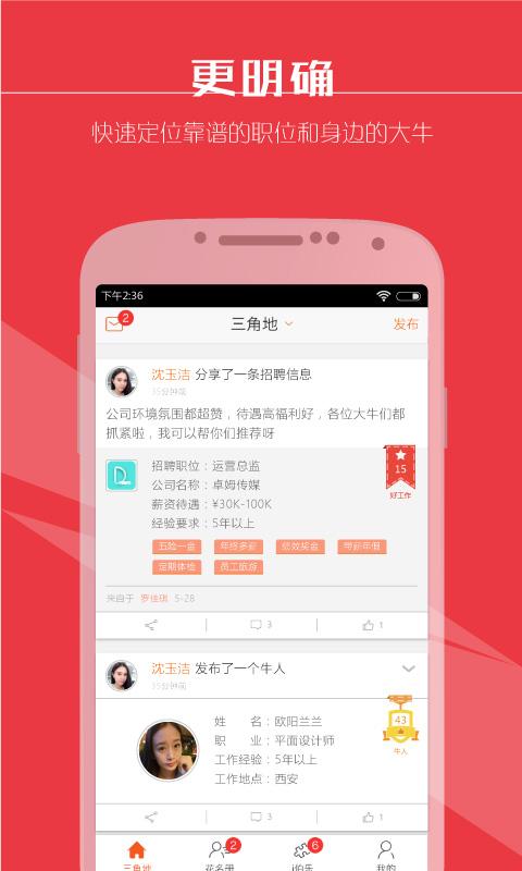 机会发布:我要招的人,我较懂,我发布的信息,在我的地盘放大N倍的传播。我get的是朋友的朋友,而不是一份份简历。有朋友推荐作为背书,人与人的连接更高效靠谱。