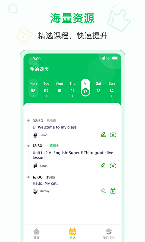孩子通过手机、平板获取课表,进入在线直播学习,与外教老师全语音互动交流。