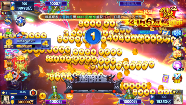 2、注意随时切换炮台在捕鱼来了中,炮台分为1倍炮,5倍炮,多倍炮等等,每种炮台发射的炮弹的威力各不相同,花费的金币也不同,那么就要根据想要捕捉的目标,随时切换炮台,以最划算的花费获取最高的收益,不要选定了一种就一直用下去,要利用好每种炮台的不同威力。
