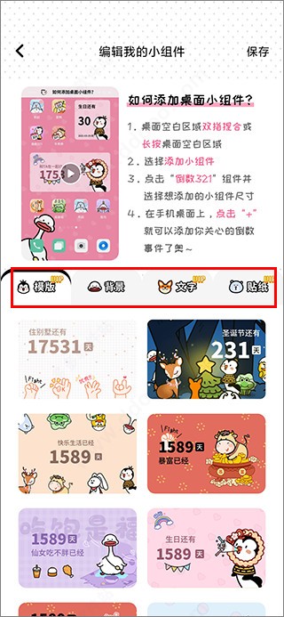 3、在设置界面,能随意编辑组件模板、背景、文件、贴纸等内容,打造专属样式。