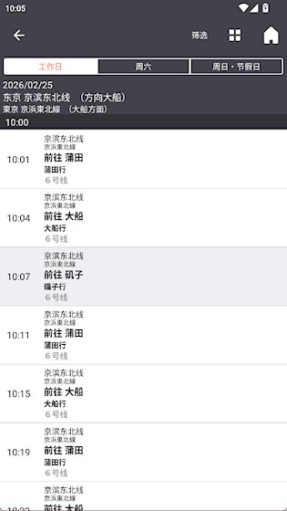 3、 时刻表查看:提供日本各车站的详细时刻表信息,支持平日、周六、节假日不同时刻表切换。