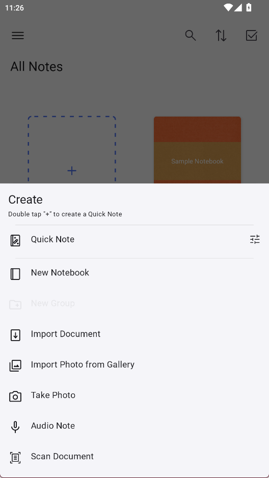 2、点击+添加笔记,有多种类型可以选择