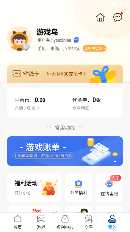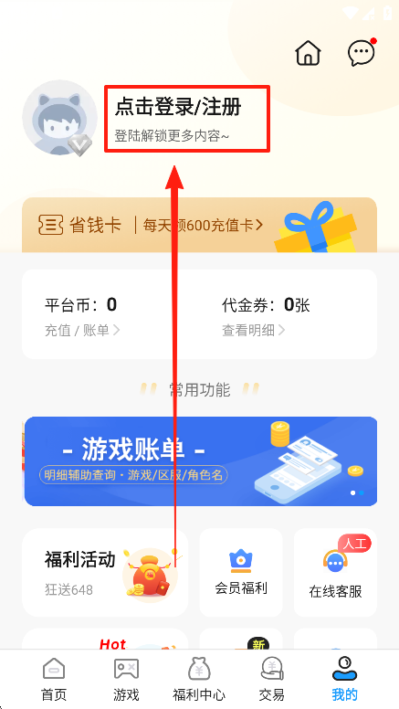 1、打开无限游戏盒,点击底部导航栏的「我的」,进入个人中心页面。