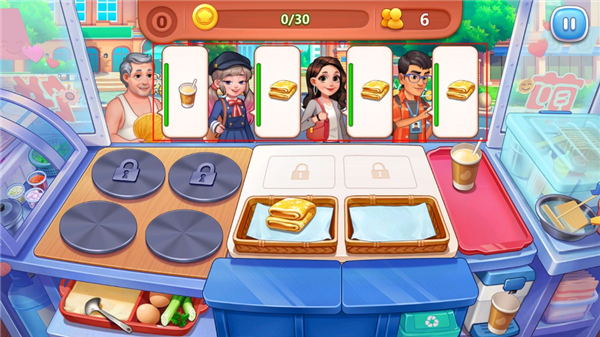 5、我们还可以通过进行厨具升级,提高烹饪的效率,比如解锁升级煎饼锅可以加快食物的制作速度,煎饼油纸可以一次性放入更多食物,