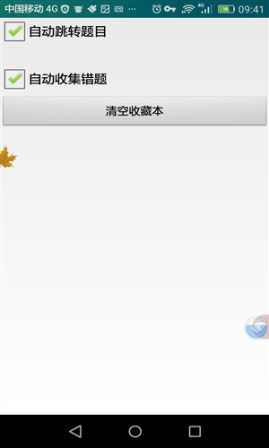 菜单的设置模块中可以设置自动跳题功能;答错题自动加到收藏本功能;清空收藏本功能。