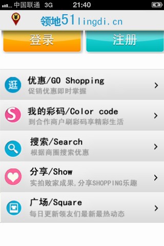 领地手机客户端,基于LBS技术,根据用户所在位置自动推荐周遍商场优惠信息、打折活动,通过领地去合作品牌消费可以获得独享优惠(比如大悦城唱歌5折、hm满100-20,zara满100-20等) 。