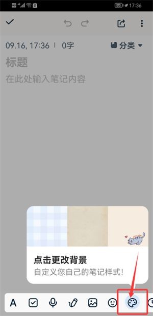 2、进入编辑页面后,点击下方调色盘图标,可自由更换笔记背景皮肤。