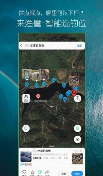 1、找钓场:通过卫星地图查找您附近的钓场。