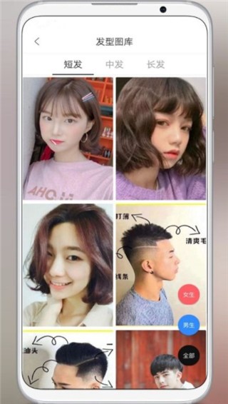 3、发型图库:包含多款发型样式,男女生长短发型等不同款式均可查看。