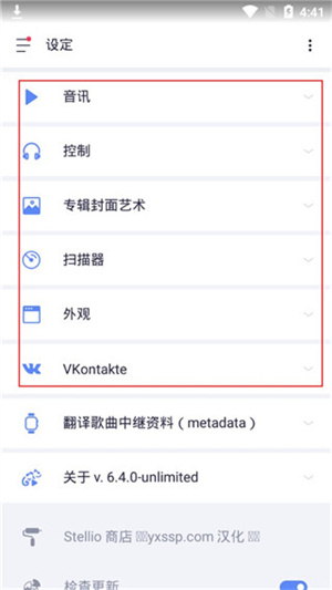 4、进入“设定”模块,可对音讯、控制、专辑封面艺术、扫描器、外观等进行自定义设置。
