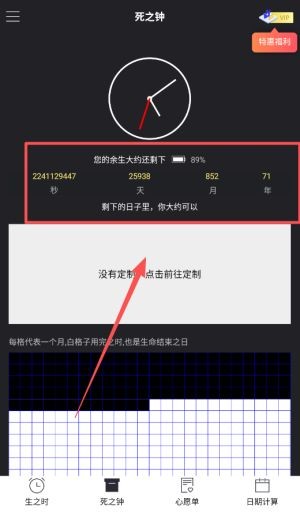 4、死之钟功能可预测寿命,提供死亡倒计时、生命倒计时服务,直观展示剩余时光。