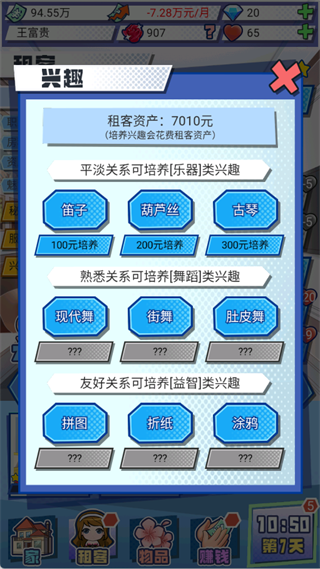 2、兴趣培养:解锁租客兴趣后,及时培养以提升租客的魅力。优先培养高魅力加成的兴趣(如乐器),这将快速提升租客的总魅力。