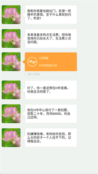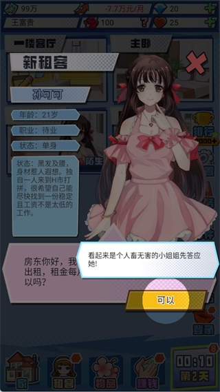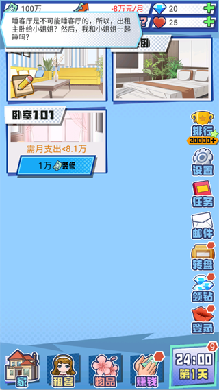 1、开局剧情:父母为你提供了100万生活费,并在H市中心首付了一套月供8万的别墅,接下来,你需要通过出租房间来还贷。