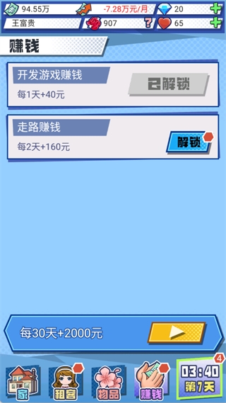 1、基础赚钱:优先解锁低成本高回报的赚钱方式,如“开发游戏赚钱”等,让你每天稳定获得收入。