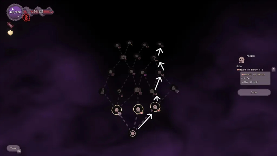 在游戏过程中,你需要选择特定路线才能继续前进。例如,上图中的路线通过触摸四个仁慈之心节点能获得最高生命值。不过,如果你走伤害加成的构建,这并不意味着这是最佳路线。