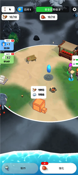 次日(日间 1,安全区 2 级):升级 “背包” 提升携带量,开始收集石料(用于制作 “石料仓库”);同时利用 “X2 加速” 缩短仓库升级时间,快速解锁更多储存空间。