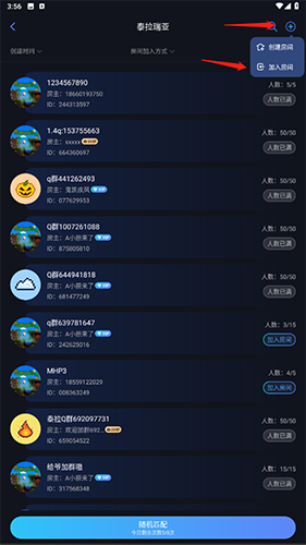 2、点击右上角的“+”按钮,然后点击“加入房间”选项。