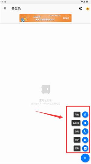 2、从弹出菜单中选择笔记或备忘录类型,进入内容创建流程。