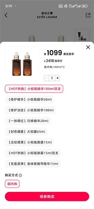 3、选定商品后,选择合适规格,点击领券购买按钮,享受对应优惠。