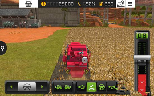 玩家需操控各类农用车辆作业。以收割机为例:将屏幕右侧推杆向上推,车辆即向前行驶;将推杆向下推至红色区域,车辆即向后倒退。
