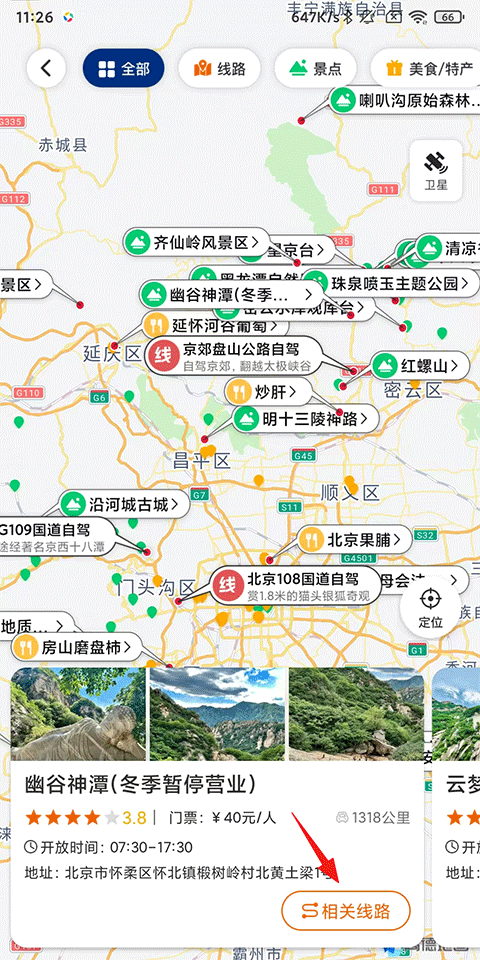 2、挑选心仪的景区景点,选中后点击页面下方的相关线路按钮。
