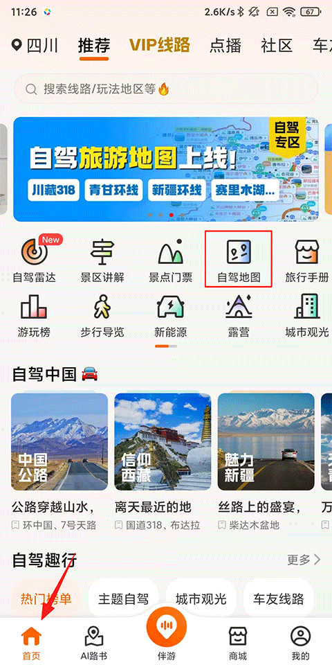 1、打开趣兜风APP,找到首页板块并点击其中的自驾地图选项。