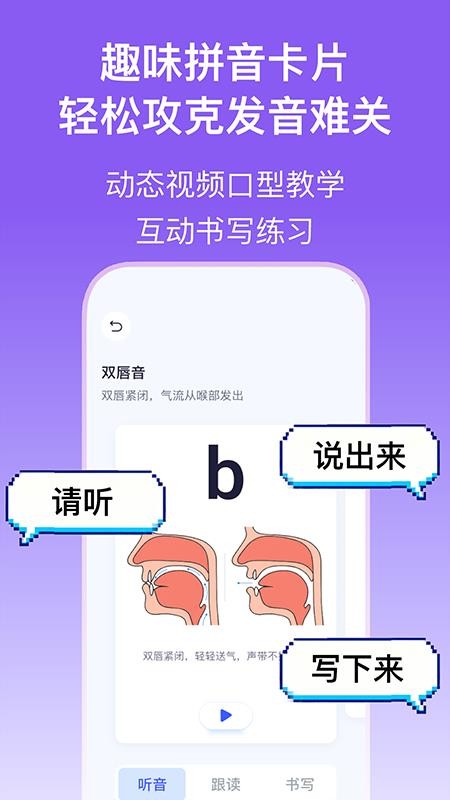 3. 拼音学习流程:在“拼音字母表”模块中,用户可先观看动态口型演示视频,了解发音部位与气流变化;随后通过“听音功能”播放标准音频,模仿练习;最后进入“跟读练习”,系统实时评分并记录错误发音供复习。
