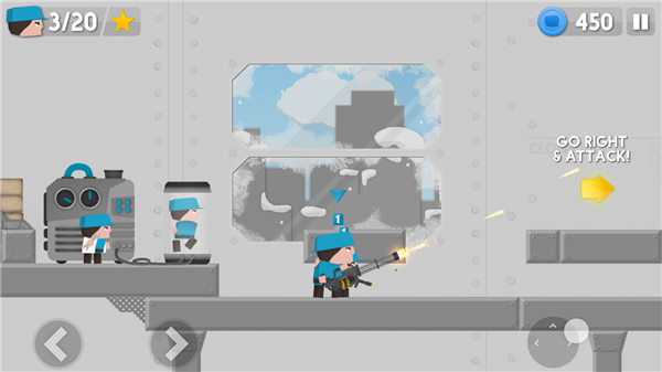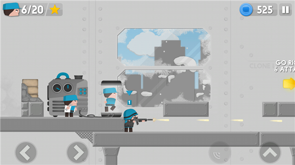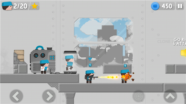 1、 双重操控:左手控制主角移动射击,右手点击按钮克隆士兵,需同时兼顾个人操作与大局调度,考验多任务处理能力。