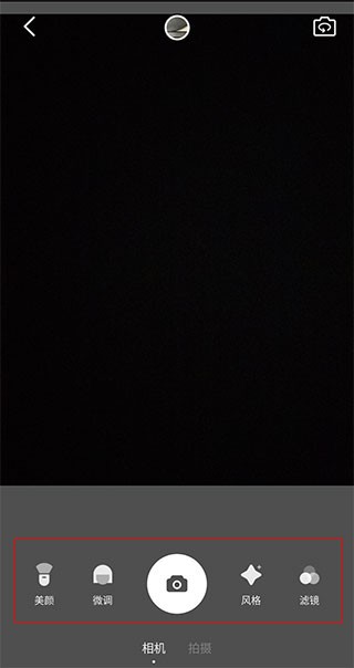 2、选择相机选项后,即可进入美颜相机界面,上方是相机选景框,选景框下方排列着各类美颜滤镜,可按需选用。