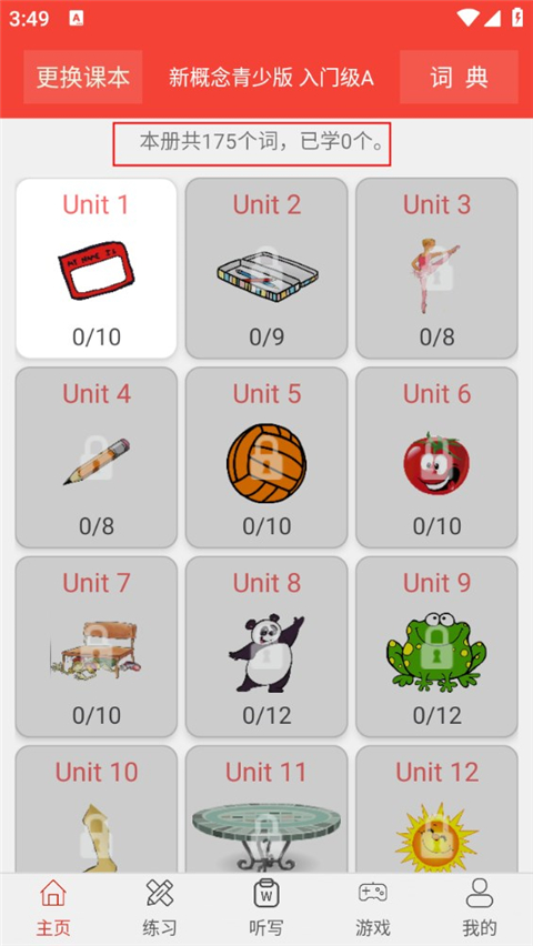 3、选定教材后即可开始系统学习,每册教材都包含专属词汇和单元课程,循序渐进提升英语能力。